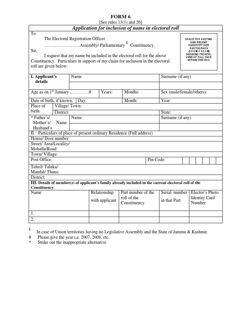 First time applicant on attaining age of 18years or more on the first day of january of the year with reference to which the electoral roll is being revised. For publishing in small booklet form for guidance of registration authorities down to booth level officers general instructions form6 who can file form 6 l please note that no fee shall be charged for the application form or for processing the form for registration by registration officer except for the election commission approved paid services at. First time applicant on attaining age of 18 years or more on the first day of january of the year with reference to which the electoral roll is being revised.